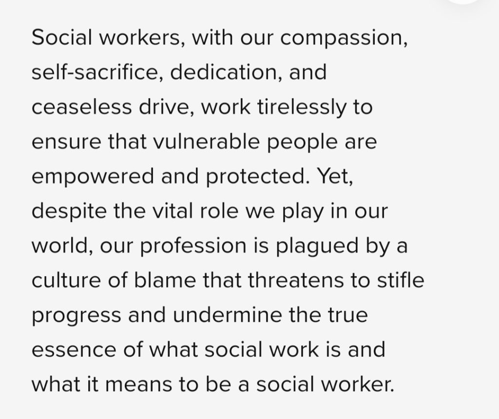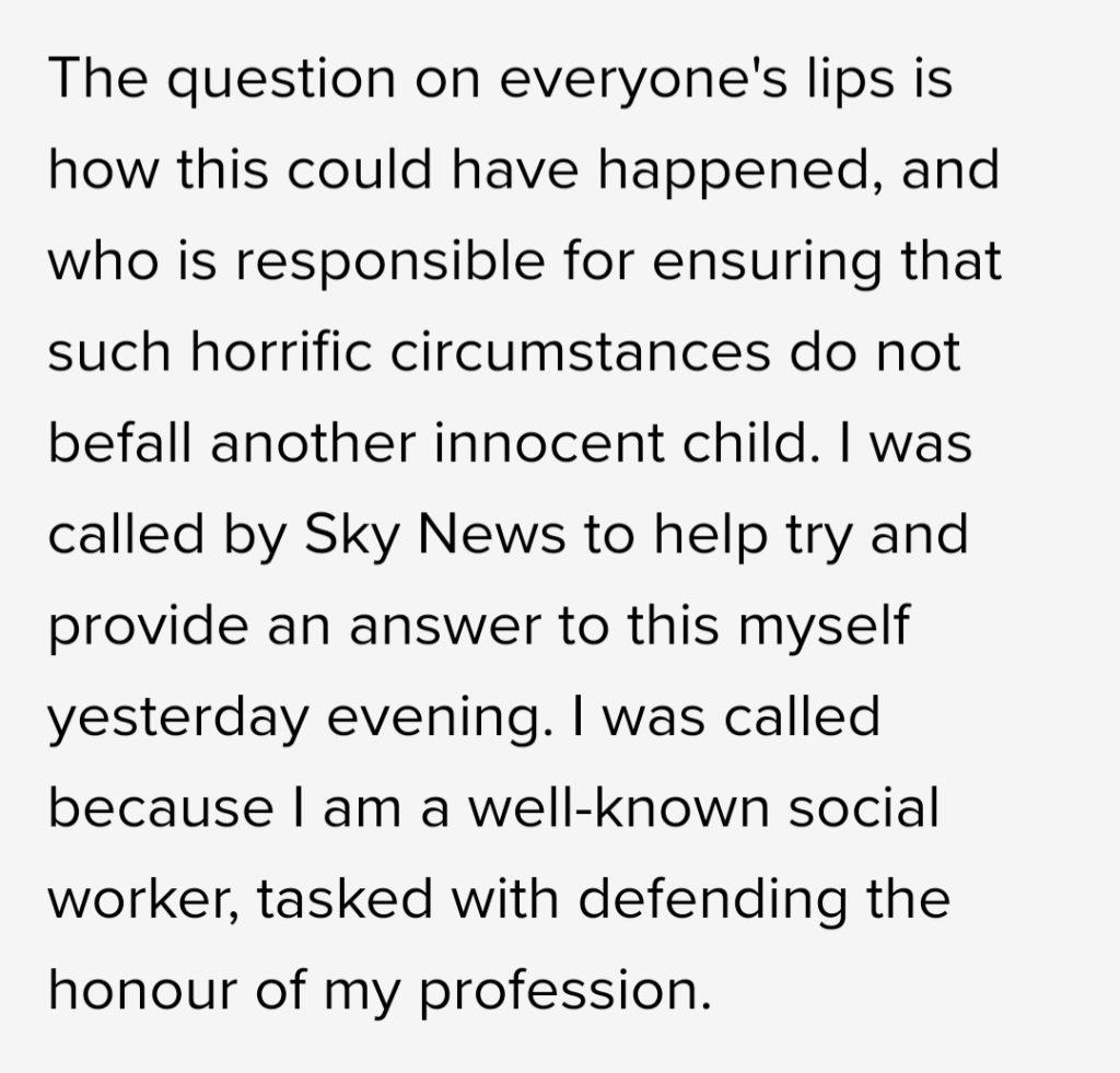 Why be over dramatic about how much hate social workers will get and how terrible it is for social workers when a child is murdered by a parent, it solves nothing and widens the chasm between social workers and those with lived experience.