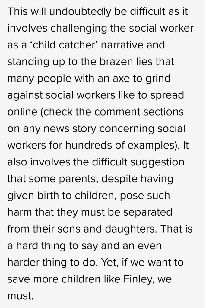 It’s going to get reactive comments, it’s going to get people slamming social workers, as the article itself blames social workers. Why not write an article slamming the Daily Mail, whose article i’ve referenced above? They are the ones with the social worker blaming headline and story. Instead he blames members of the public and “the brazen lies that many people with an axe to grind against social workers like to spread online” He even suggests we check the comments of news articles, so I did, mostly people saying the same as the article said.