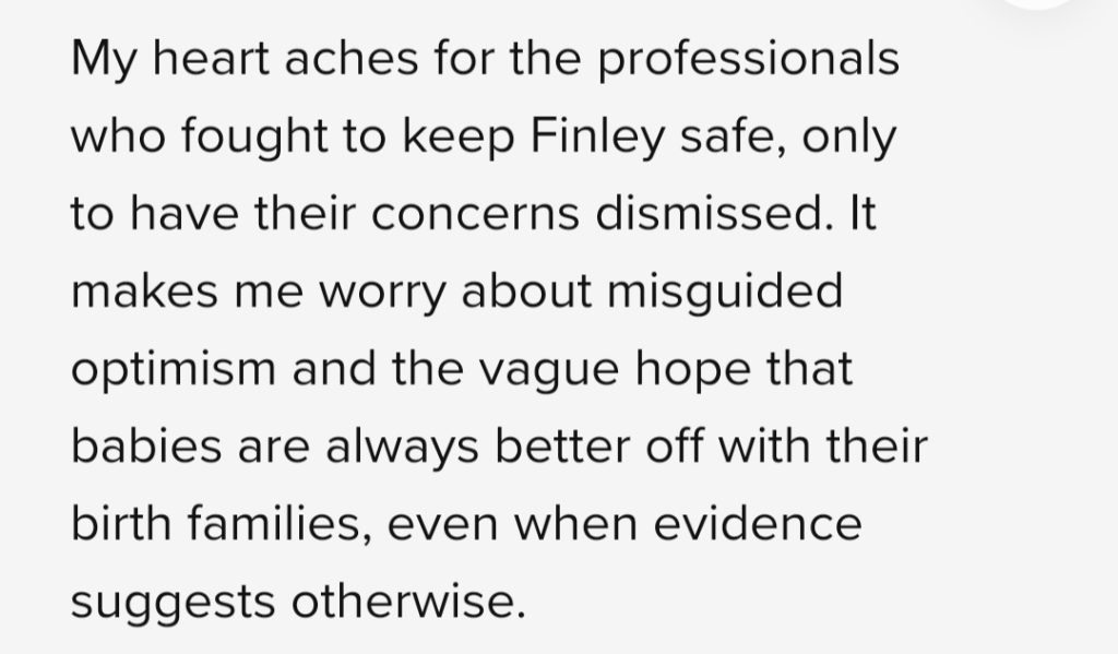 It is crystal clear now that Finley should never have been with his parents. It is imperative that this is investigated thoroughly and any learning is shared.