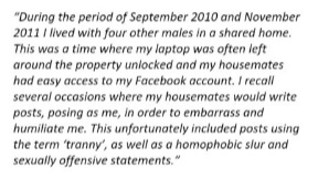 Gabriel Lowrie was purposefully dishonest in an attempt to mislead the case examiners into believing he was a vulnerable 18 year old who had literally just left home when the posts were made to start his first year at university.