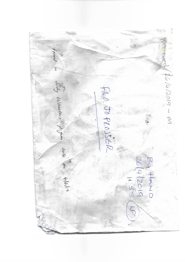 At the bottom of the envelope you can see where Jo Prosser has written that it was found in Jody Wheeler’s pigeonhole on the 4/6/19, which was the day it was handed back to us.