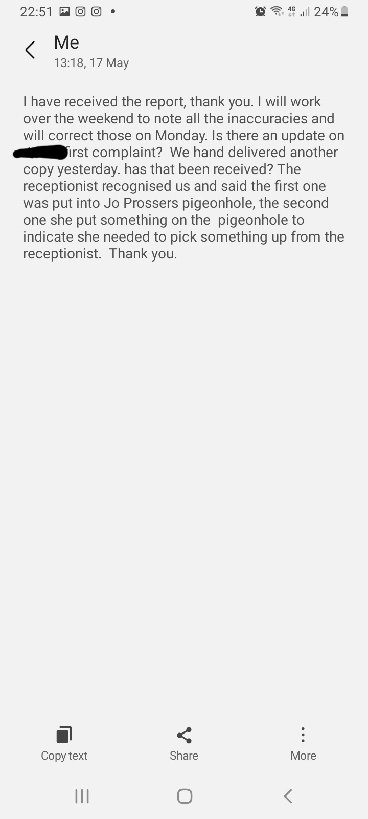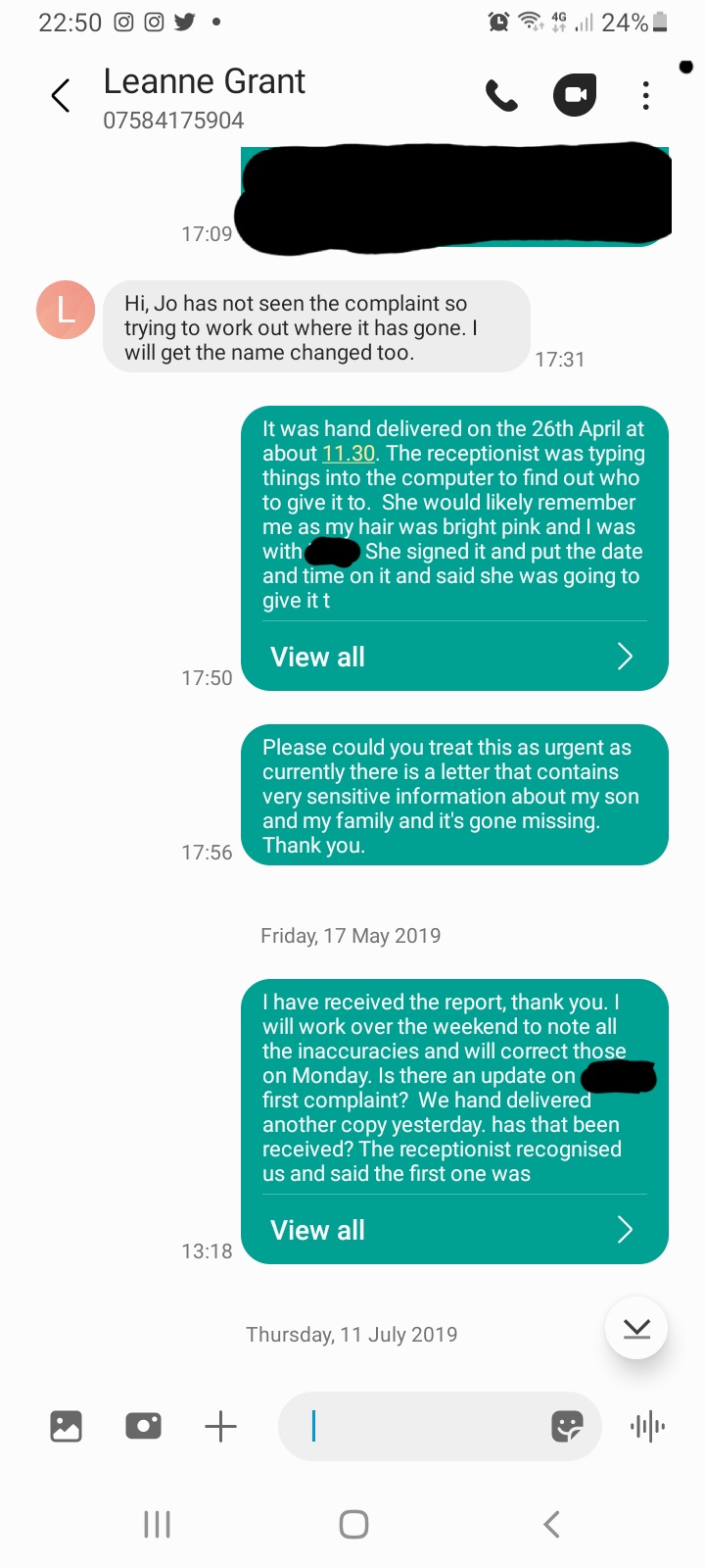 As you can see from the text messages, a copy of the complaint was handed in, to exactly the same place on the 17th May. The receptionist was confused as to where the first one was stating clearly that she put it in Jo Prosser’s pigeonhole, I was very noticeable as I had pink hair at the time.