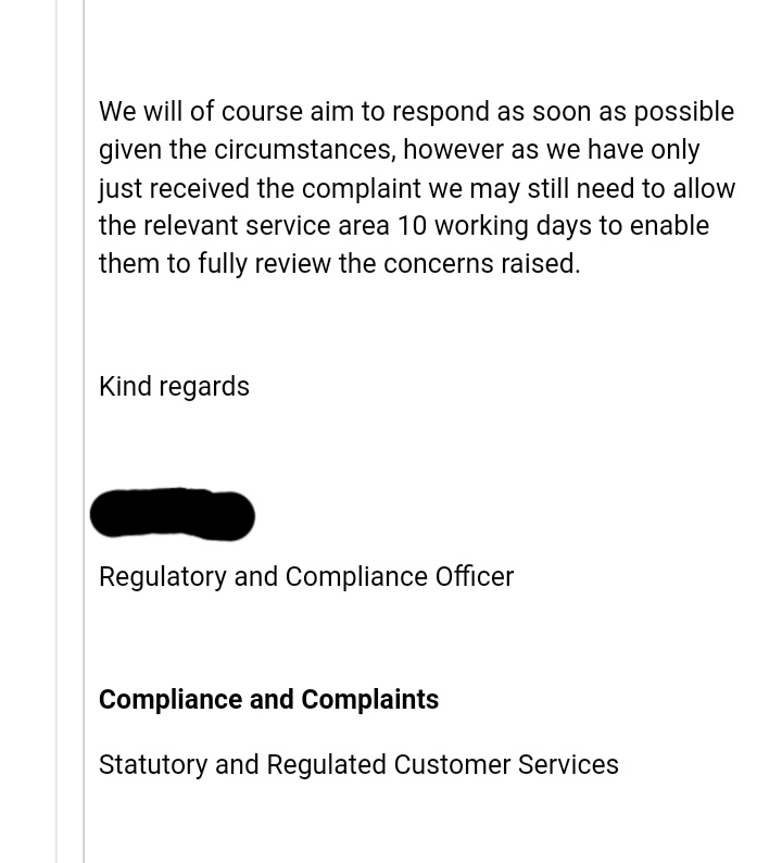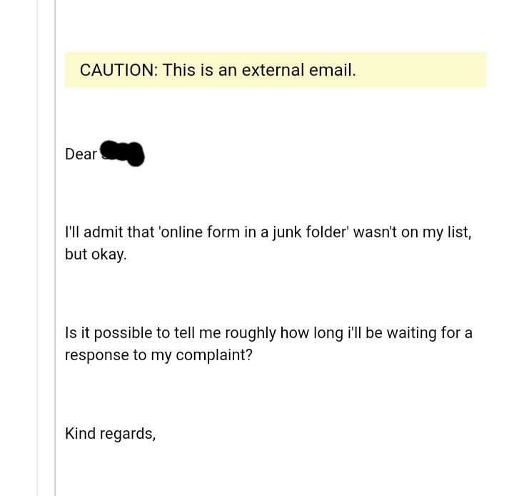I am unlikely to get a response before the new year due to the delay while my complaint was in the ‘junk folder’.