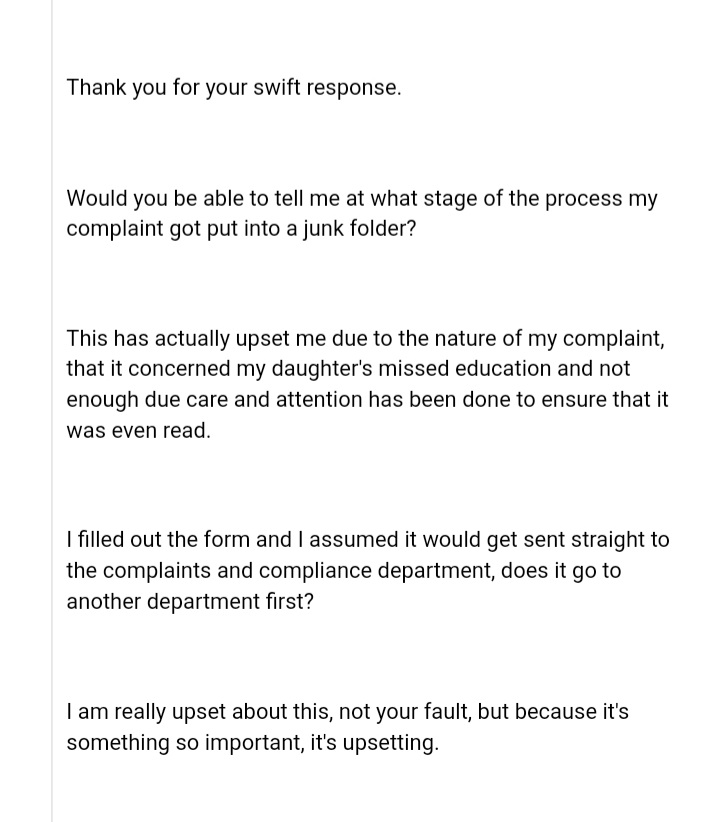 I submitted a complaint regarding my child missing 4 years of school due to ECC not offering any support for my child’s SEND needs. This was on the 26th November. My complaint should have been answered on the 10th December.