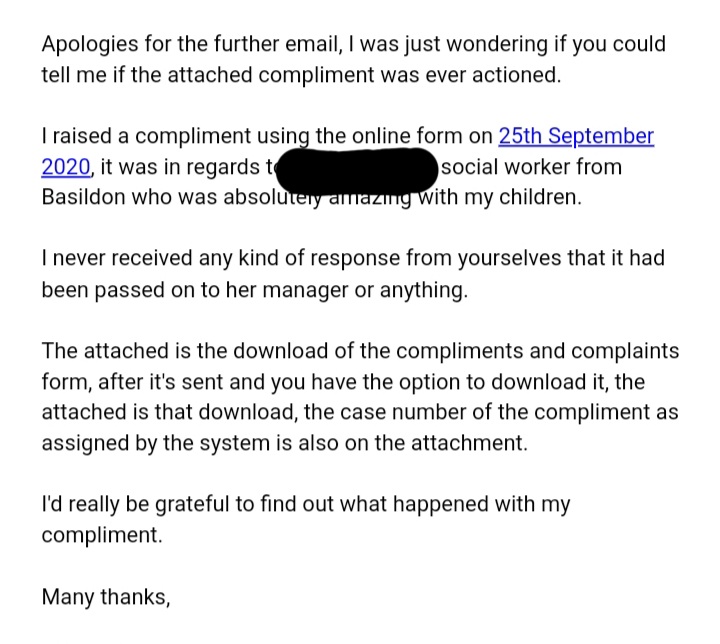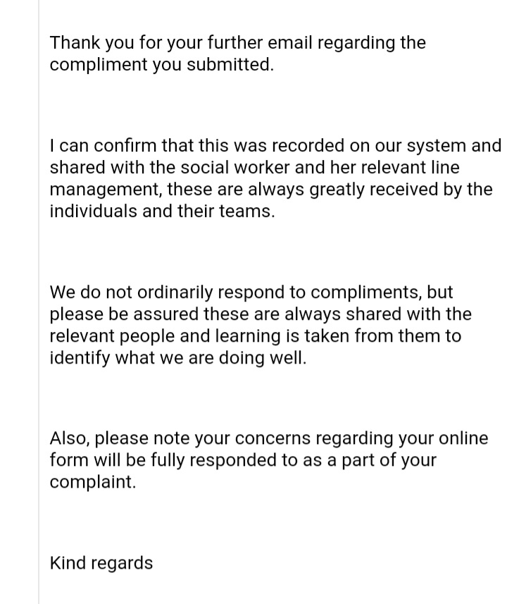 I then sent a further email, this is regarding a compliment I submitted in September 2020 about a social worker, I never had a response after I filled out the compliment form and submitted it.