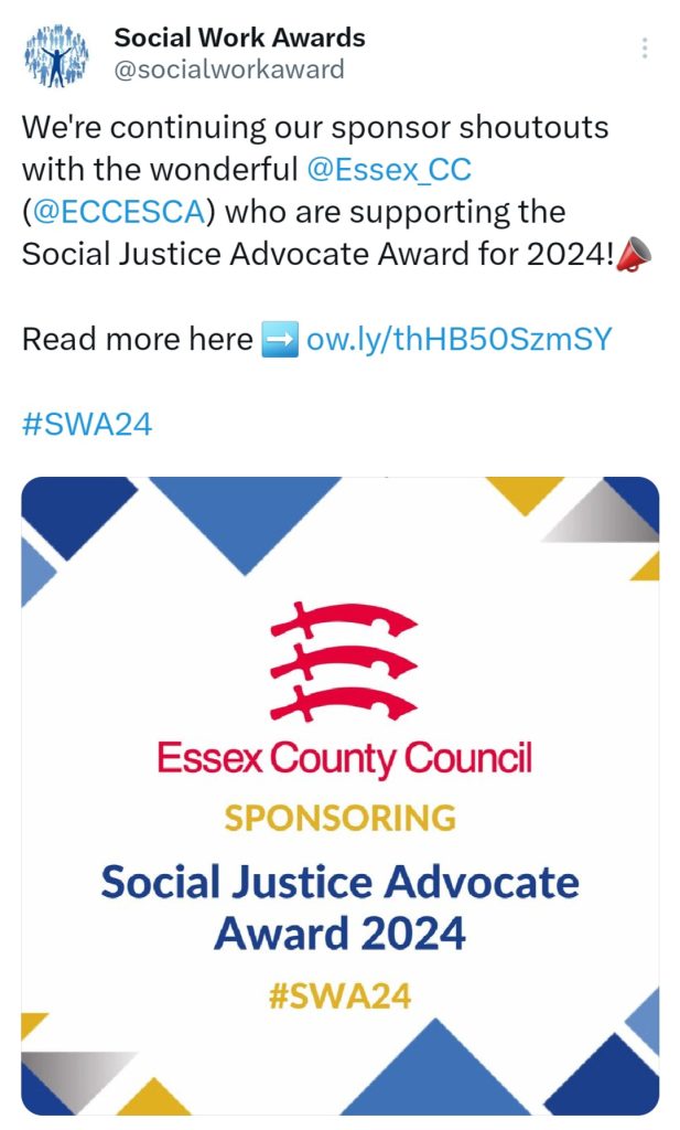 As it’s all about showing off, Essex County Council will do anything to win, even if it involves cheating, corruption isn’t new at Essex County Council, it’s encouraged as long as the members have something to brag about. The post I will link below is one I made almost two years ago which highlights the lengths that the Essex Social Care Academy go to so that they ‘win’ awards. I’ve made a few posts on the Social Work Awards, if you click on the Social Work Awards category thing they should come up if you really want to read them all. The social work awards are extremely problematic.